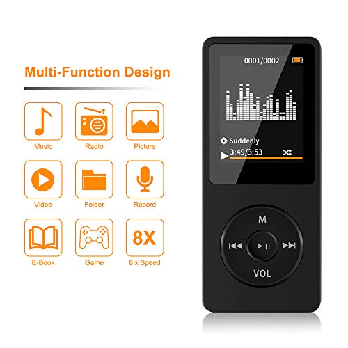 Specification: Wodgreat MP3-speler, 8 GB, MP3-speler, sport MP4-speler, 100 uur standby-tijd, verliesvrije klank, muziekspeler met hoofdtelefoon, luidspreker, FM-radio, e-book video, voicerecorder, ondersteunt tot 128 GB