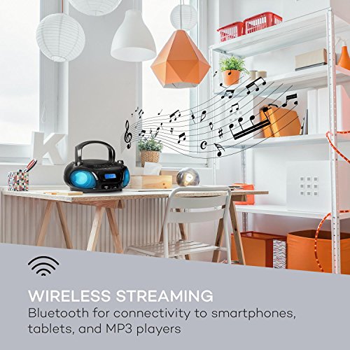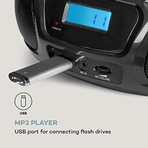 VEELZIJDIG COMPATIBEL: De Boombox heeft een cd- / mp3-speler en een mp3-compatibele USB-poort. Als er geen gegevensdragers bij de hand zijn, levert de FM-radio lokale hitstations of het laatste nieuws, zodat verveling wordt voorkomen.