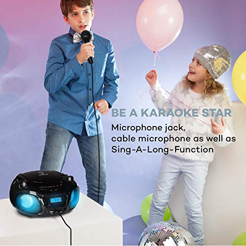 auna Roadie Sing – CD-MP3 karaoke-speler, stereo, boombox, sing-a-long-functie, USB-poort, FM-radio, Bluetooth 3.0, LED-verlichting, netvoeding en batterijvoeding, microfoon, zwart