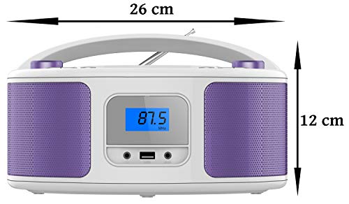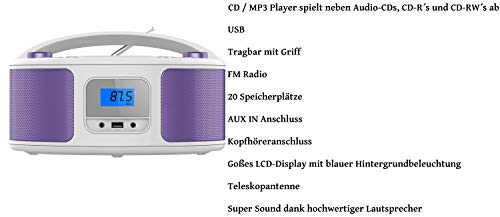 Draagbare cd-speler, Boombox, CD/CD-R, USB, FM-radio, AUX-in, hoofdtelefoonaansluiting, cd-speler, kinderradio, cd-radio, stereo-installatie, compact systeem (loopy lila)