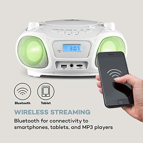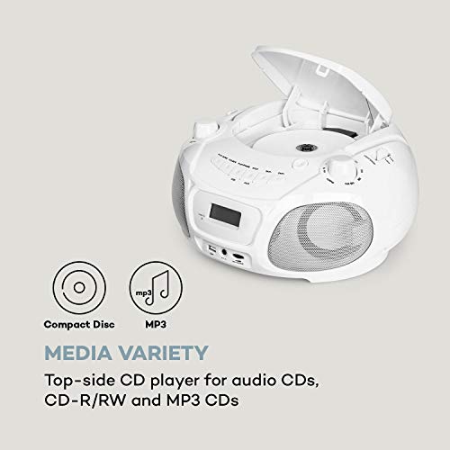VEELZIJDIG COMPATIBEL: De Boombox heeft een cd- / mp3-speler en een mp3-compatibele USB-poort. Als er geen gegevensdragers bij de hand zijn, levert de FM-radio lokale hitstations of het laatste nieuws, zodat verveling wordt voorkomen.