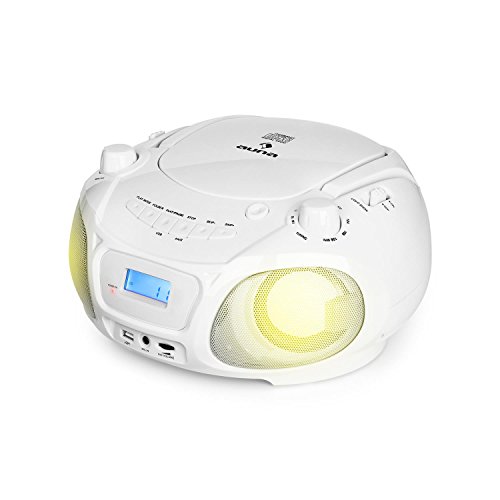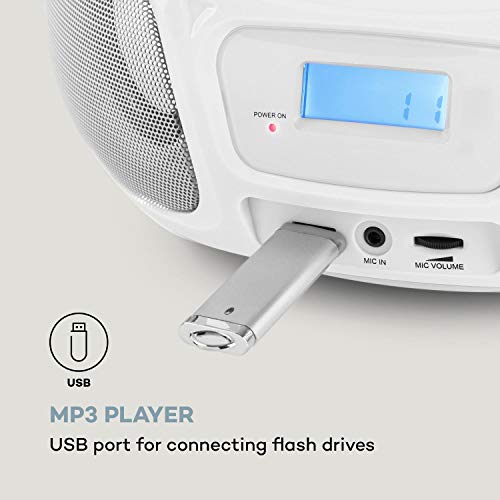 auna Roadie Sing – CD-MP3 karaoke-speler, stereo, boombox, sing-a-long-functie, USB-poort, FM-radio, Bluetooth 3.0, LED-verlichting, netvoeding en batterijvoeding, microfoon, wit