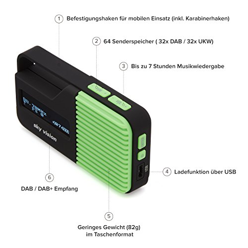Specification: Sky Vision DAB Radio 10 G – kleine, draagbare mini digitale radio, outdoor, DAB+, FM/FM-tuner, USB-oplaadfunctie (groen)