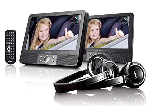 Lenco MES-415 Draagbare dvd-speler met dubbel scherm, USB en SD-aansluiting, 12 volt auto-adapter, afstandsbediening, 2 x hoofdsteunbevestiging, 2 x koptelefoon, zwart